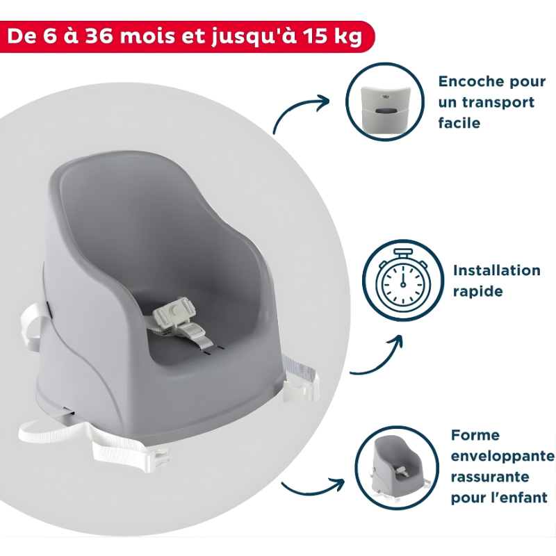 Conforme, facile à monter et très confortable pour mon fils! Elle s’emboîte facilement à notre table à manger, ainsi bébé a vraiment l’impression d’être assis avec nous.
